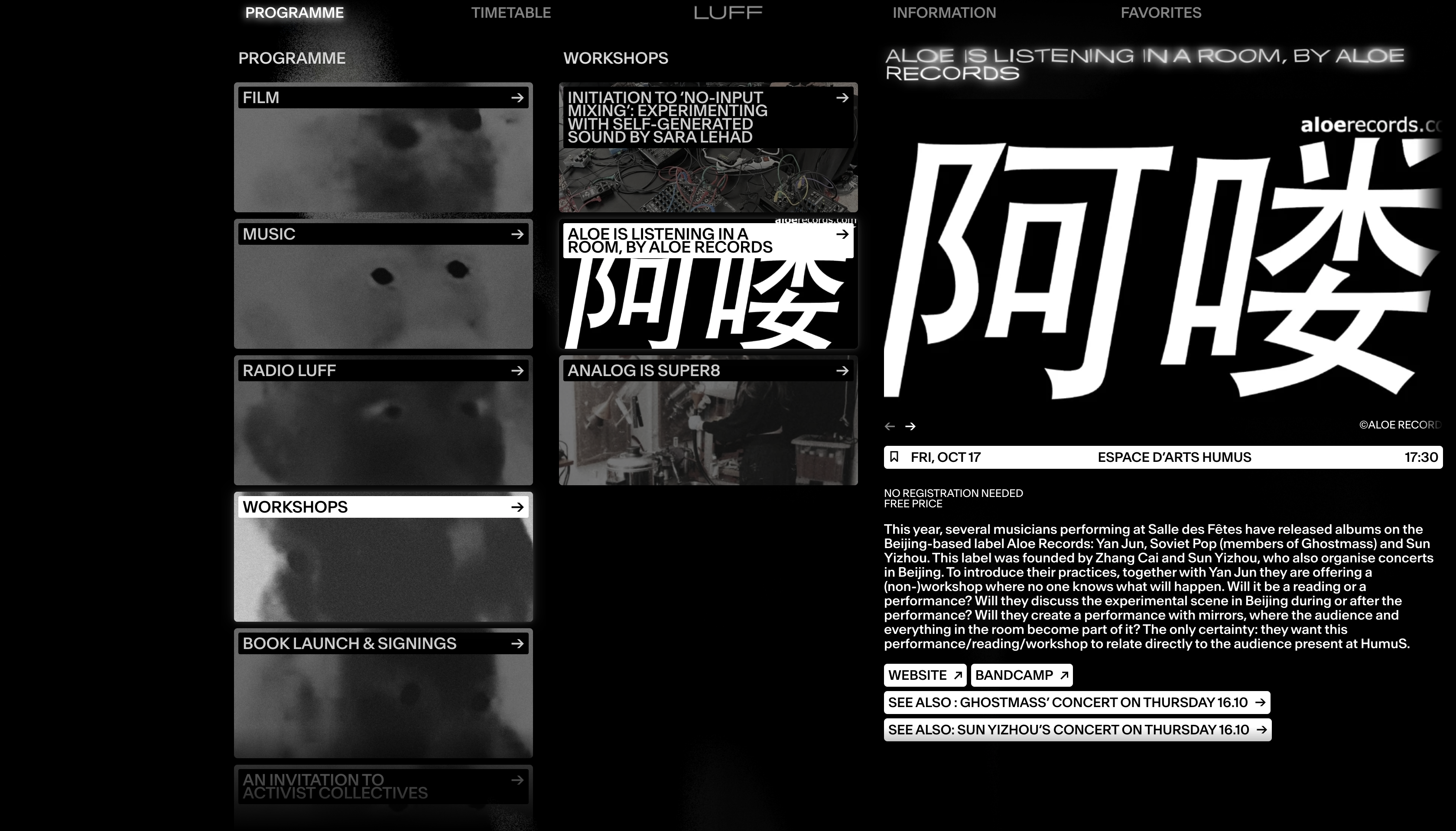 This year, several musicians performing at Salle des FĂȘtes have released albums on the Beijing-based label Aloe Records: Yan Jun, Soviet Pop (members of Ghostmass) and Sun Yizhou. This label was founded by Zhang Cai and Sun Yizhou, who also organise concerts in Beijing. To introduce their practices, together with Yan Jun they are offering a (non-)workshop where no one knows what will happen. Will it be a reading or a performance? Will they discuss the experimental scene in Beijing during or after the performance? Will they create a performance with mirrors, where the audience and everything in the room become part of it? The only certainty: they want this performance/reading/workshop to relate directly to the audience present at HumuS.